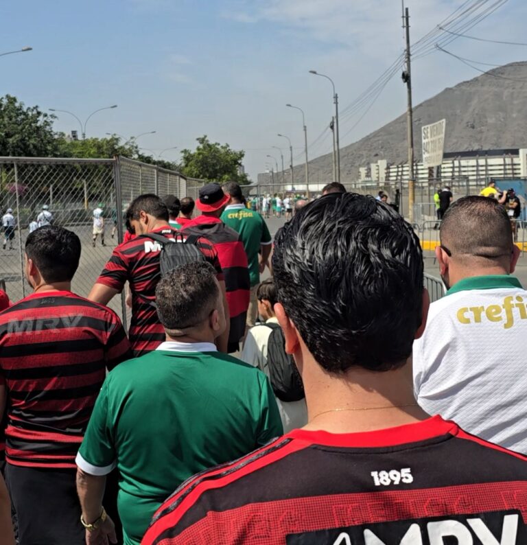 A entrada de torcedores no Estádio Monumental, em Lima, tem sido marcada por tranquilidade e respeito entre flamenguistas e palmeirenses que chegaram cedo para acompanhar a final da Libertadores. Apesar da rivalidade esportiva, o ambiente nas imediações do estádio é de festa e convivência pacífica.