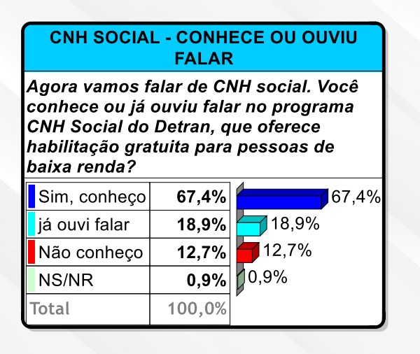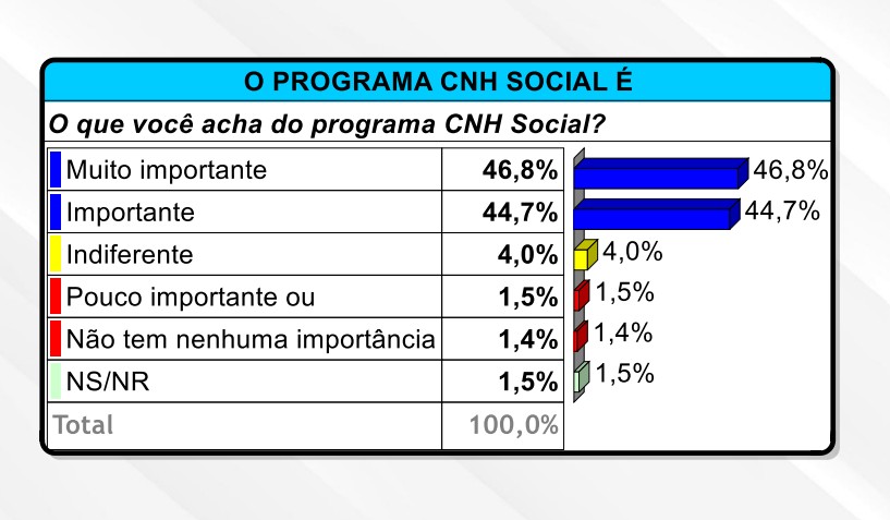 O programa CNH Social, que oferece carteira de motorista gratuita para pessoas de baixa renda, é bem avaliado pela população do Acre, segundo pesquisa do Data Control. Quando questionados sobre sua importância, 46,8% consideram “muito importante” e 44,7% “importante”, somando 91,5% de avaliação positiva. Apenas 1,4% veem o programa como sem importância.