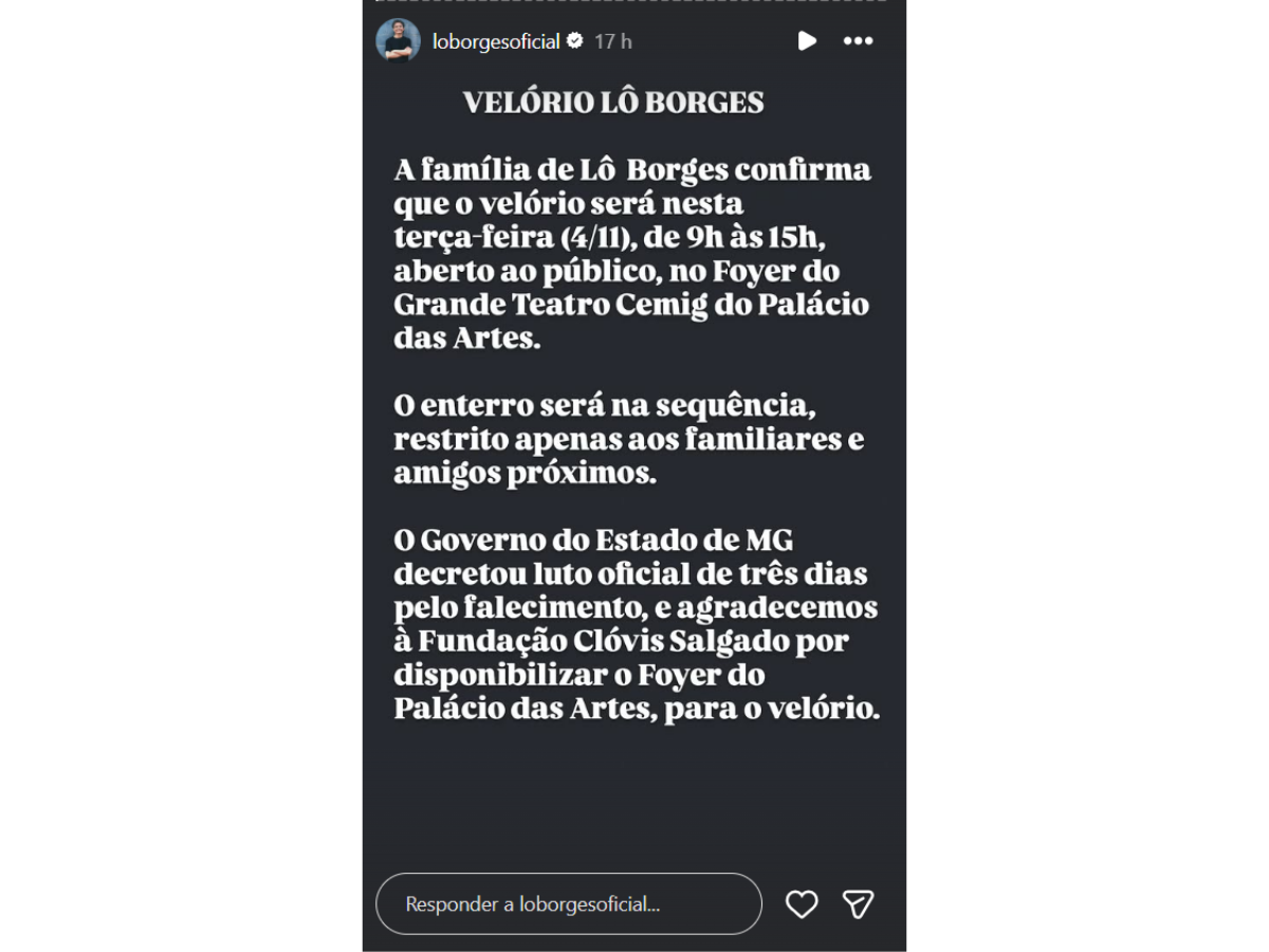 No Instagram, familiares lamentaram a morte do artista: ” É com enorme tristeza que anunciamos o falecimento do nosso querido Lô Borges, aos 73 anos, na noite de domingo (02/11/25), em Belo Horizonte-MG. Ele lutou bravamente por 17 dias, mas agora foi descansar. Sua arte viverá para sempre. A família pede privacidade neste momento para que possam enfrentar o luto reservadamente e, desde já, agradecemos a todas manifestações de carinho e de solidariedade.”