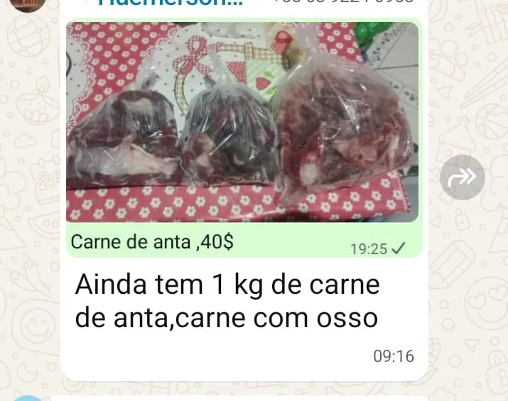 Registros feitos em um grupo de WhatsApp apontam que carne de anta estaria sendo vendida ilegalmente no Acre. As mensagens revelam que o quilo do produto estaria sendo anunciado por R$ 40.