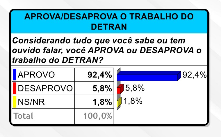 O trabalho do Departamento Estadual de Trânsito do Acre (Detran-AC) é amplamente reconhecido e aprovado pela população. Segundo pesquisa realizada pelo Data Control a pedido do próprio órgão, 92,4% dos acreanos aprovam o trabalho desenvolvido pelo DETRAN no estado.