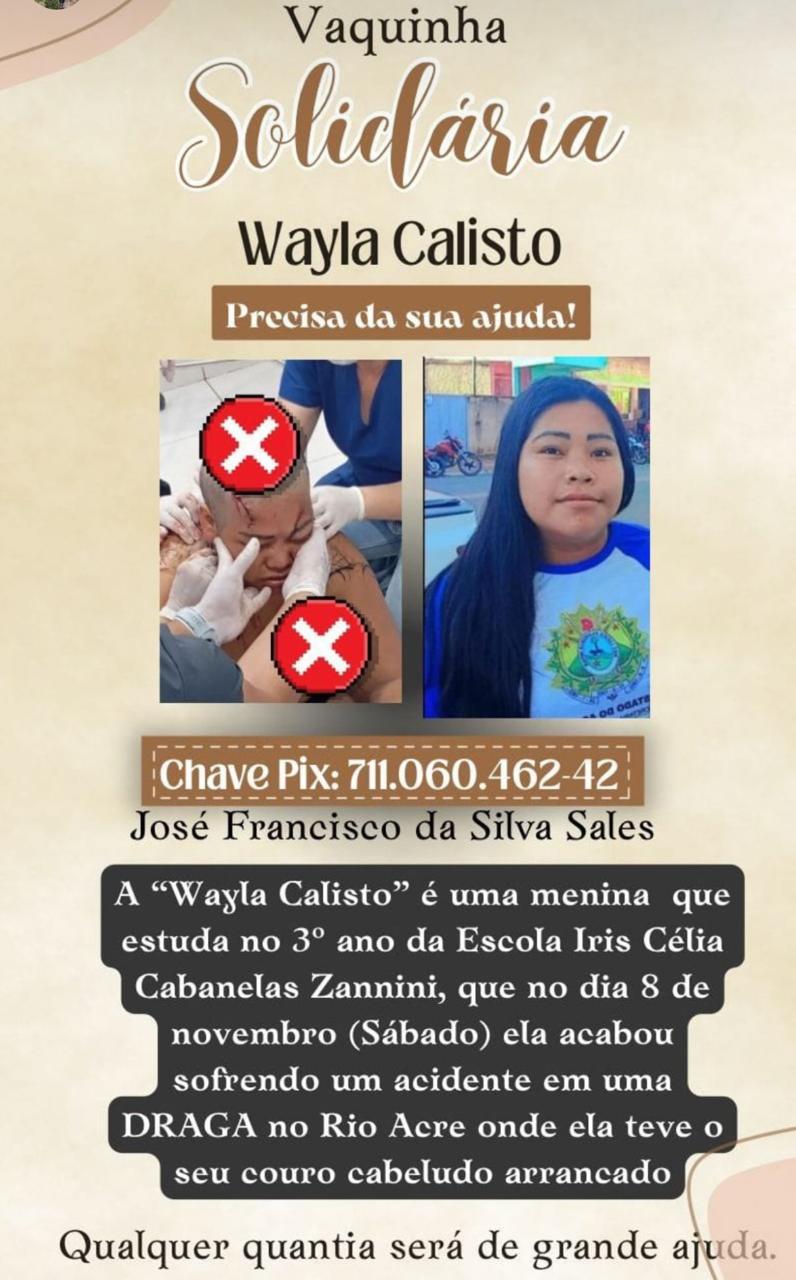 A jovem Wayla Calisto, estudante do 3º ano da Escola Iris Célia Cabanellas Zannini, em Assis Brasil, foi vítima de um grave acidente no último sábado (8), enquanto trabalhava em uma draga nas águas do Rio Acre.