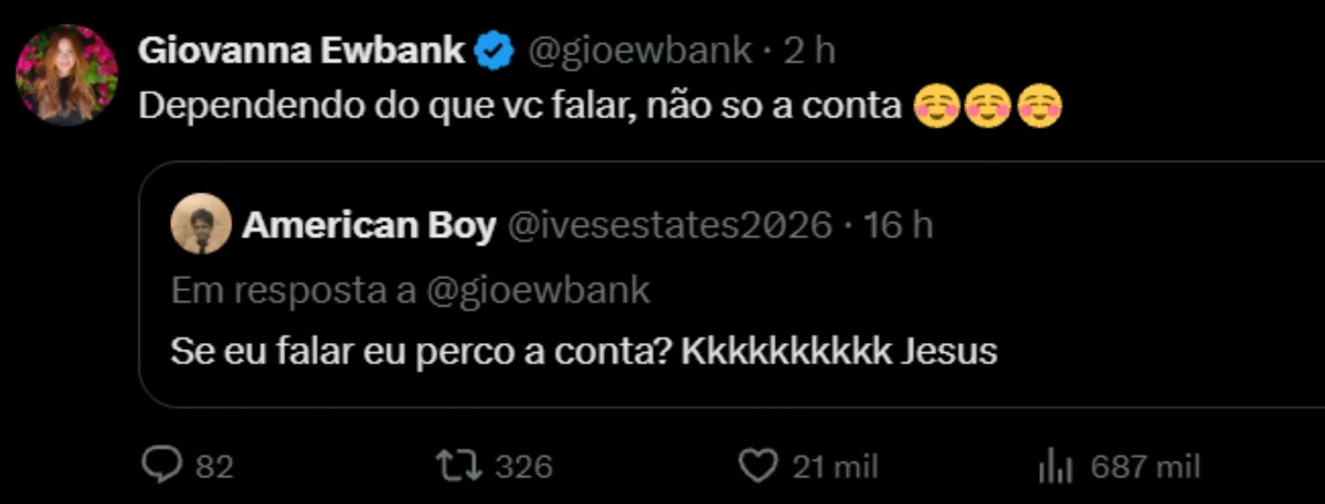 No X, antigo Twitter, um usuário comentou: “Se eu falar eu perco a conta? Kkkkkkkkkk Jesus”. Ao ver o comentário, Giovanna reagiu: “Dependendo do que você falar, não só a conta”, declarou.