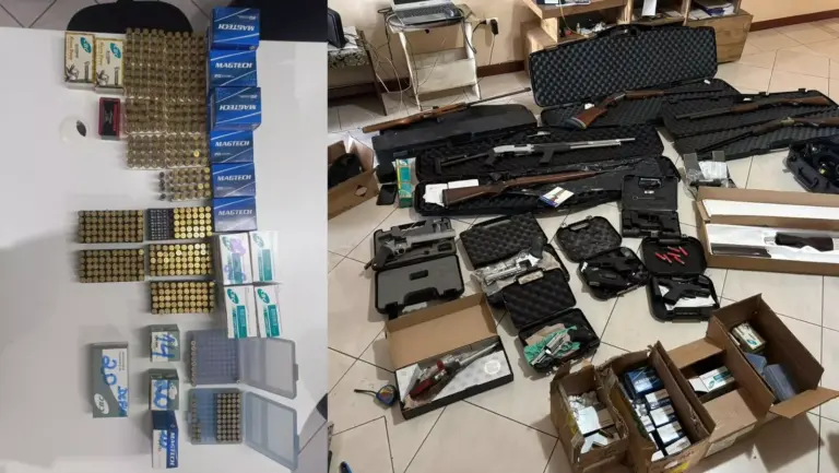 Durante a vistoria no apartamento, a PM localizou um grande arsenal de armas de fogo, incluindo quatro espingardas calibre 12, duas carabinas, quatro pistolas calibre .380, quatro revólveres de calibres variados (.44, .45, .38 e .36), além de 631 munições, 40 estojos deflagrados e dinheiro em espécie.