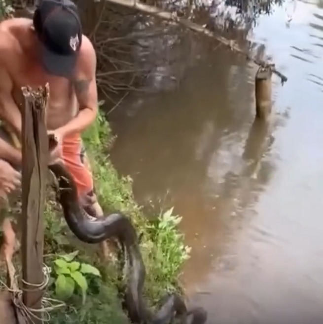 Sucuri gigante de mais de 3 metros é filmada e solta por moradores em região ribeirinha/Foto: Reprodução