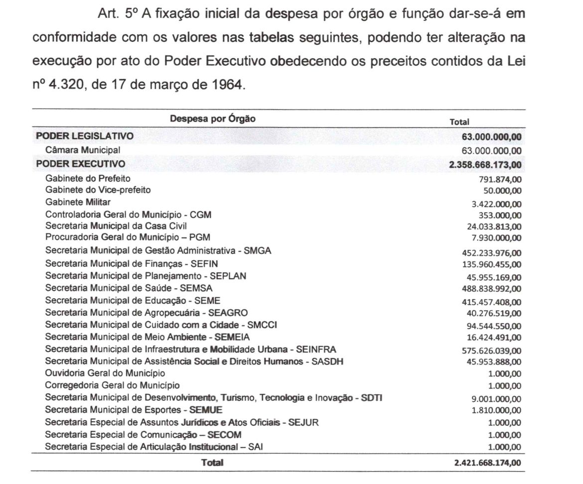De acordo com o documento, a Secretaria Municipal de Infraestrutura (Seinfra) deve concentrar o maior orçamento, estimado em R$ 575,6 milhões, enquanto a Secretaria Municipal de Saúde (Sensa) aparece em seguida, com aproximadamente R$ 488,8 milhões. Já órgãos como a Ouvidoria, a Corregedoria e as secretarias de Assuntos Jurídicos, Articulação e Comunicação estão entre os que terão os menores investimentos, com apenas R$ 1 mil previsto, para cada.