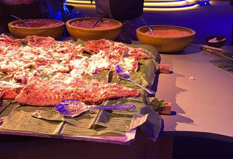 O cardápio do coquetel foi assinado pelo chef paraense Saulo Jennings, que escolheu servir dois peixes típicos da Amazônia: o pirarucu e o filhote. Os peixes foram colocados inteiros sobre uma mesa.
