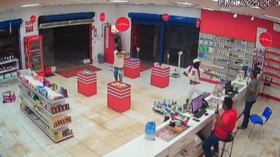 O primeiro alvo do grupo foi uma farmácia localizada na Avenida Amadeo Barbosa. No local, eles ameaçaram funcionários e levaram dinheiro do caixa, além de outros objetos.