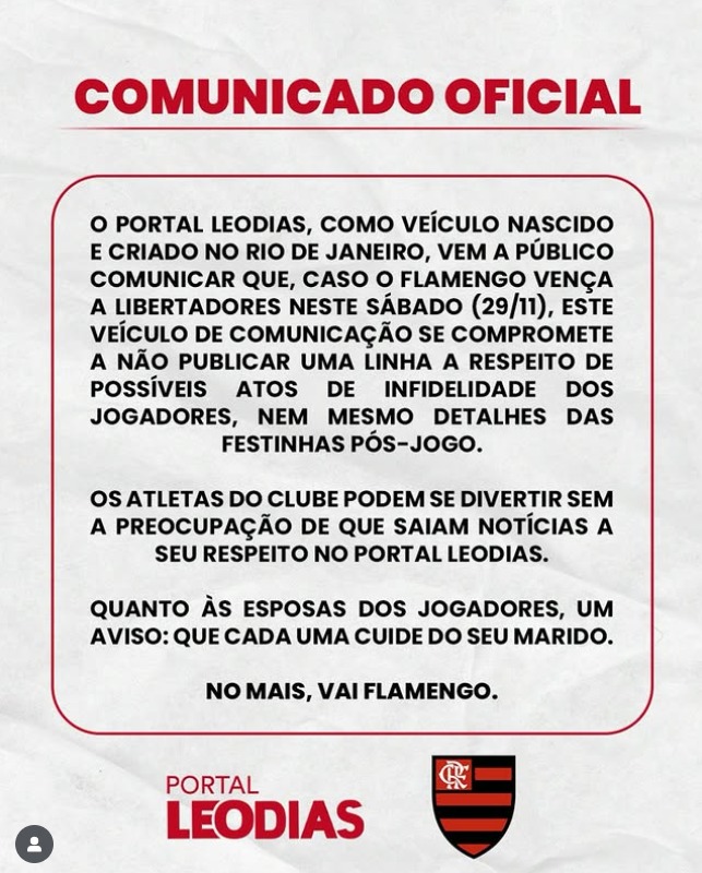 No texto, divulgado em seu perfil no Instagram, que reúne mais de 18 milhões de seguidores, Leo brinca com sua própria reputação de “expositor oficial de celebridades” e garante que não noticiará possíveis episódios de infidelidade, festas particulares ou qualquer movimentação extra-campo envolvendo os atletas rubro-negros. Ele ainda reforça, em tom bem-humorado, que as esposas dos jogadores devem “cuidar de seus maridos”, porque dele não sairá nenhuma linha.