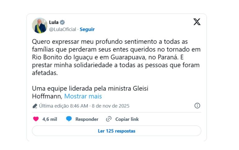 O presidente Lula se manifestou na manhã deste sábado (8) sobre o tornado que deixou seis pessoas mortas no Paraná. Em publicação nas redes sociais, ele expressou profundo sentimento a todas as famílias que perderam seus bens queridos no tornado em Rio Bonito do Iguaçu e em Guarapuava. Ele também prestou solidariedade a todas as pessoas que foram afetadas.