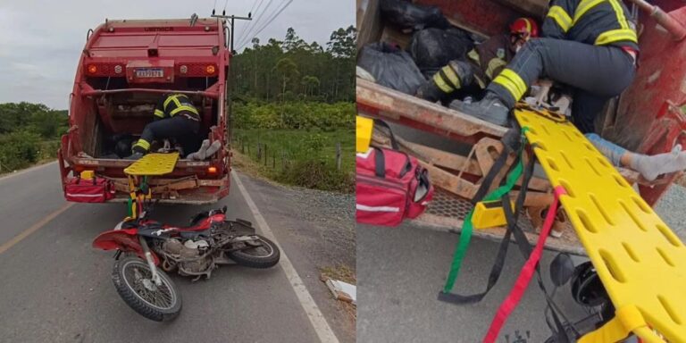 Um motociclista ficou ferido após colidir com um caminhão de coleta seletiva de lixo e ser arremessado para dentro do compartimento de carga do veículo, em Araquari, no Norte de Santa Catarina. O acidente ocorreu na Rua Rio do Morro, no bairro Itinga, na tarde de quarta-feira (6).