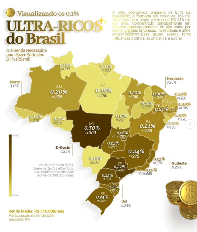 Mapa mostra a distribuição dos 0,1% mais ricos do Brasil. No Acre, 0,18% da população tem renda mensal acima de R$ 210 mil, segundo dados do Ipea e da Receita Federal (2025)/Foto: Reprodução/Brasil em Mapas