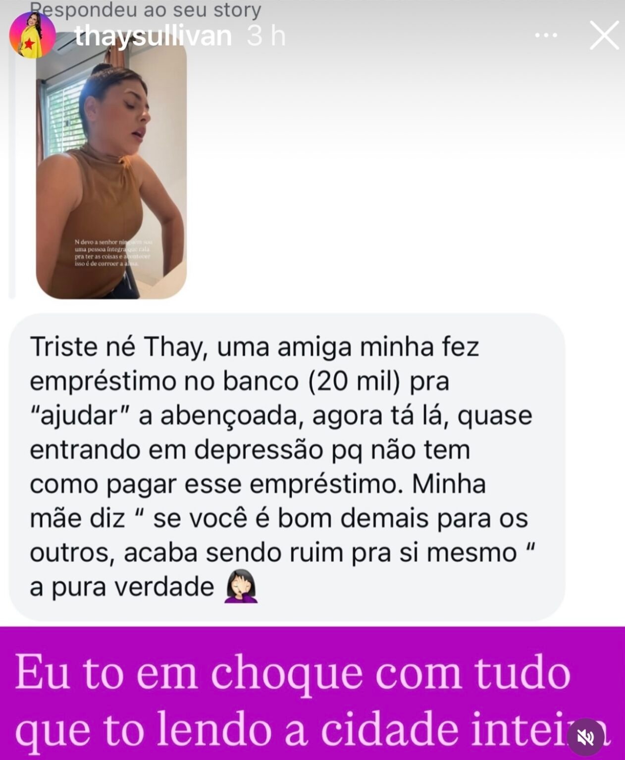 “Não foi pirâmide, foi empréstimo. Emprestei porque era minha amiga. Já era a terceira vez que eu ajudava. Nunca cobrei juros. Mas, infelizmente, dessa vez ela sumiu”, escreveu Thay em uma publicação que rapidamente ganhou repercussão e gerou grande mobilização entre seus seguidores.