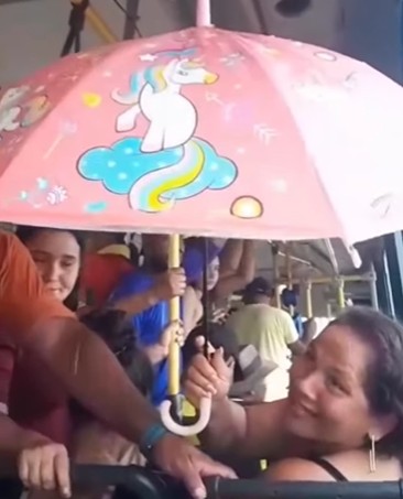 Passageiros precisaram abrir guarda-chuvas dentro do veículo devido a infiltrações durante a chuva/Foto: Reprodução