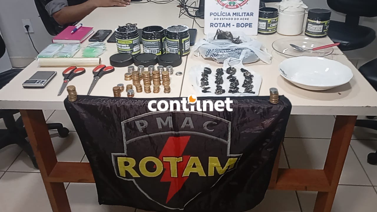 Ao todo, foram apreendidas 30 trouxinhas de cocaína, além de diversos itens usados no preparo e comercialização da droga, como sacos plásticos, tesoura, balança de precisão, prato com resquícios de entorpecente, celulares, potes para armazenamento e uma agenda contendo anotações financeiras da suposta boca de fumo.