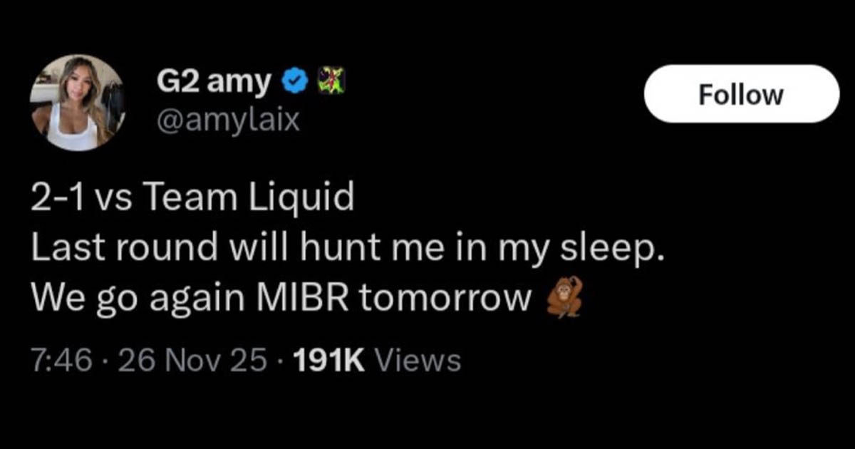 A G2 perdeu a série por 2 a 1 — com domínio brasileiro em Haven (13–3), revés em Corrode (2–13) e vitória apertada em Split (14–12). O clutch decisivo de daiki, que encerrou a partida, foi mencionado no desabafo de amy no X (antigo Twitter). No mesmo post, a atleta citou o MIBR, adversário do próximo confronto, e adicionou um emoji de macaco, o que gerou forte repercussão negativa entre fãs brasileiros.