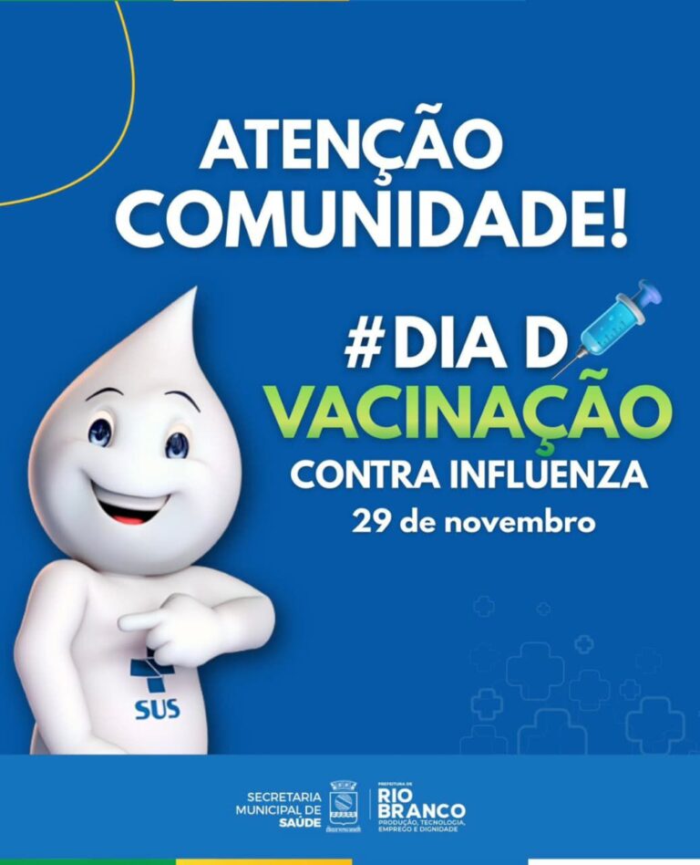 A Prefeitura de Rio Branco realiza neste sábado, 29 de novembro, uma nova edição do Dia D de Vacinação contra a Influenza. A ação acontecerá em pontos estratégicos da cidade e entre eles no Via Verde Shopping, das 14 às 22 horas, em um ponto montado ao lado do quiosque do Flamengo. Com objetivo de ampliar o acesso da população à imunização e reforçar a proteção antes do período de maior circulação do vírus.
