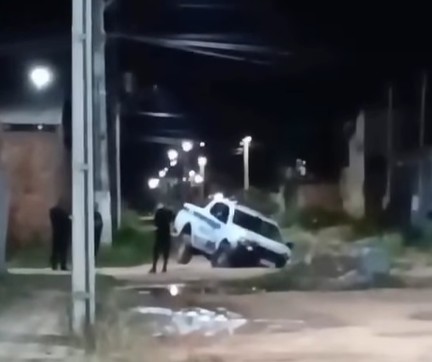 Uma ronda de rotina da Polícia Militar terminou de forma inesperada na noite desta quarta-feira (5), quando uma viatura afundou em uma cratera no bairro Santo Afonso, em Rio Branco. O vídeo do incidente foi publicado nas redes sociais por Júnior Nascimento e mostra o carro com a frente submersa no buraco.