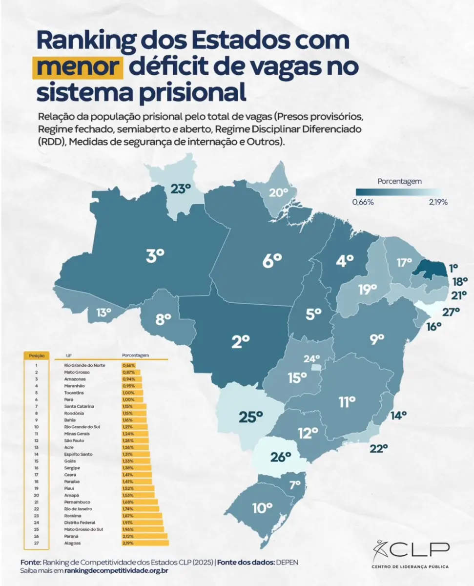 Segundo o estudo, que compõe o pilar de Segurança Pública do Ranking de Competitividade dos Estados, o Acre registra um déficit de 1,26%, índice considerado baixo diante da realidade nacional. O cálculo leva em conta todas as modalidades de custódia: presos provisórios, regimes fechado, semiaberto e aberto, além do Regime Disciplinar Diferenciado (RDD) e medidas de segurança.