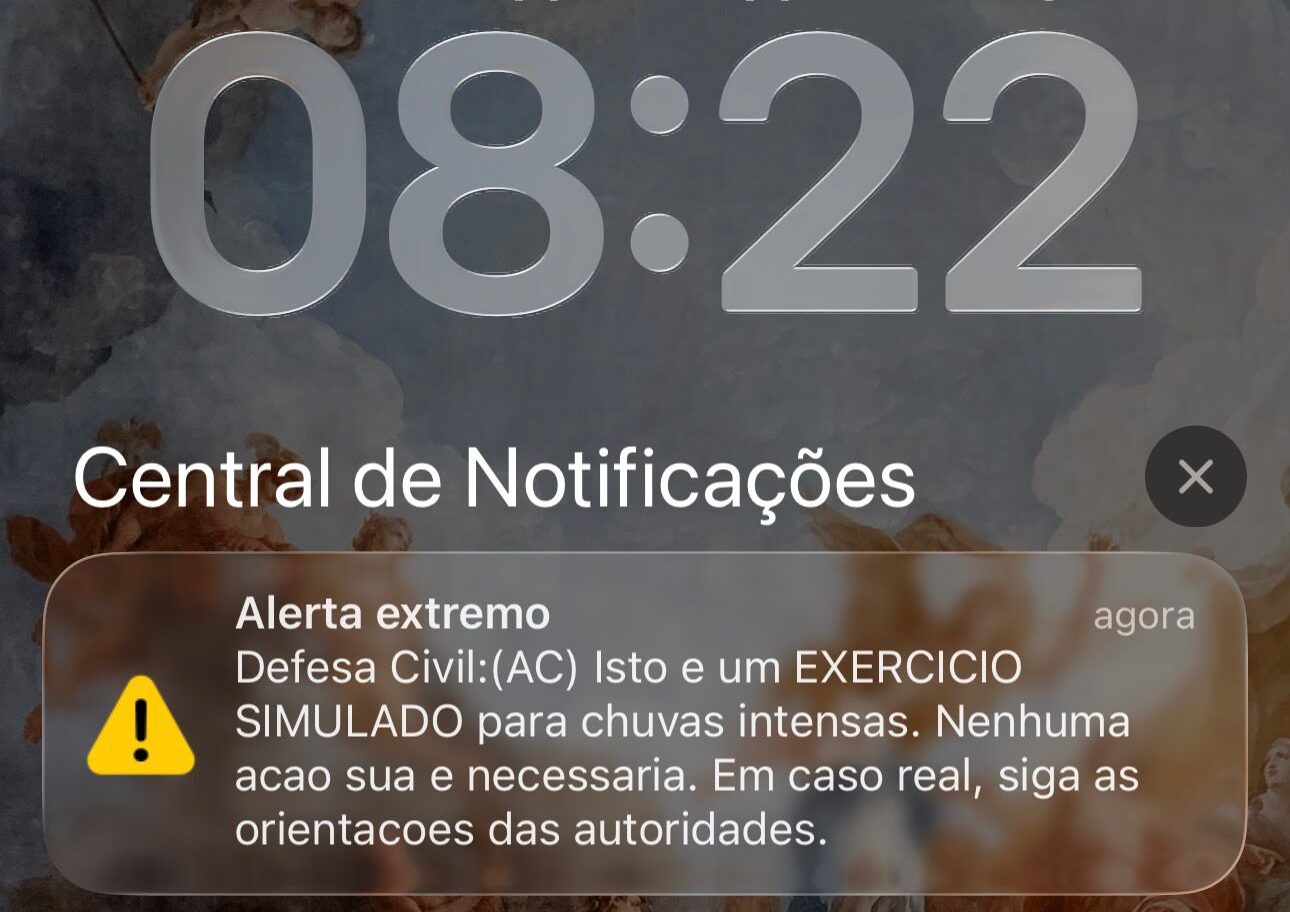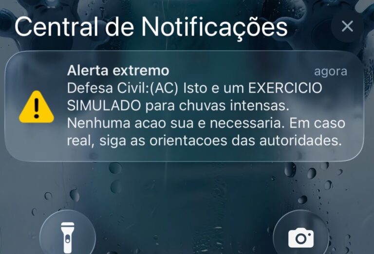 A Defesa Civil do Acre emitiu, neste sábado (13), por volta das 8:20 da manhã, um alerta extremo que foi enviado diretamente para celulares em todo o estado por meio do sistema de notificações de emergência. A mensagem chamou a atenção da população ao aparecer automaticamente nos aparelhos móveis, acompanhada de sinal sonoro e destaque visual.