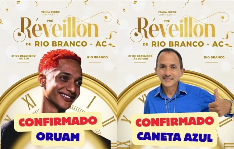 Uma publicação que circula nas redes sociais nesta semana chamou a atenção dos internautas ao anunciar, de forma inusitada, as supostas atrações do Réveillon de Rio Branco. O card, divulgado na página do Instagram BMAC TV 24Horas, traz os nomes de Caneta Azul e Oruam como “confirmados” para a festa de virada do ano na capital acreana.