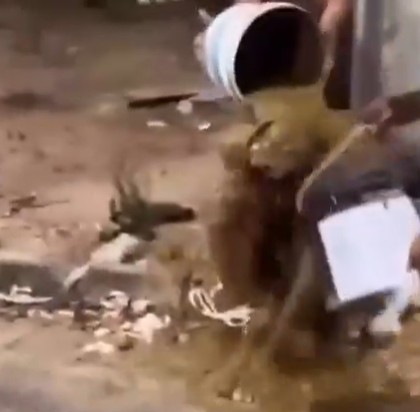 Momento em que moradores jogam fezes em suspeito detido após um roubo; vídeo viralizou nas redes sociais e gerou debate sobre violência e justiça/Foto: Reprodução