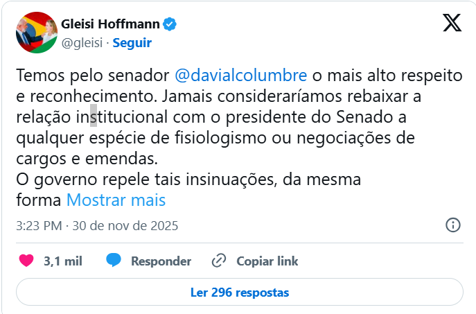 “O governo repele tais insinuações, da mesma forma que fez o presidente do Senado em nota na data de hoje, por serem ofensivas à verdade, a ambas as instituições e a seus dirigentes”, escreveu a ministra no X (antigo Twitter).