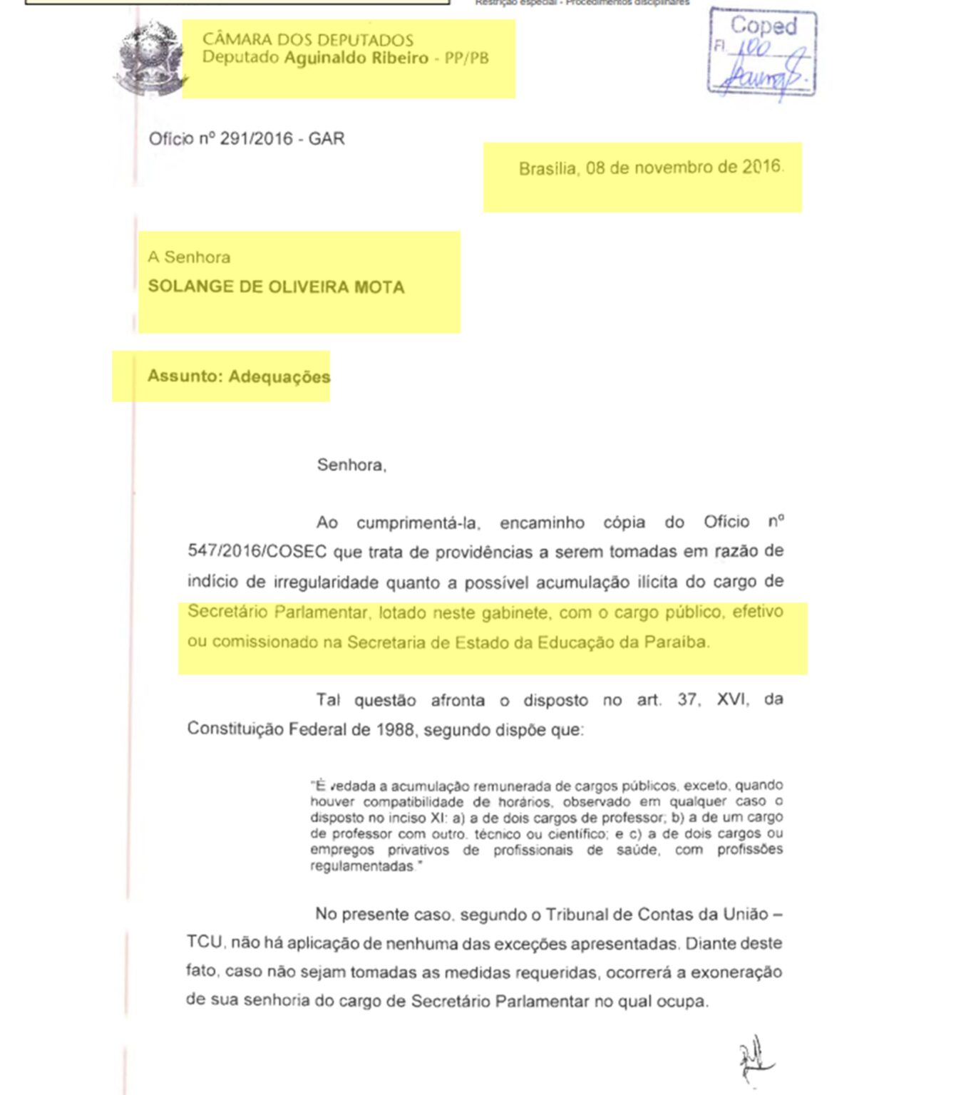 “A senhora Solange Oliveira Mota, no momento em que foi contratada como assessora parlamentar por este gabinete, apresentou declaração de não acumulação de cargos públicos. Ela desempenhou as funções parlamentares, a que era demandada e, no momento em que foi entendido pela irregularidade da acumulação dos cargos públicos o deputado federal Aguinaldo Ribeiro exonerou a antiga servidora.