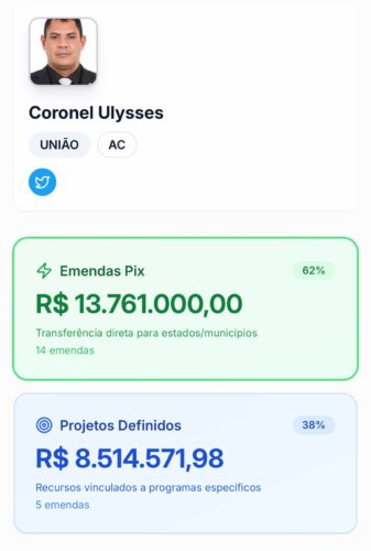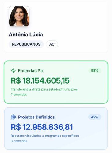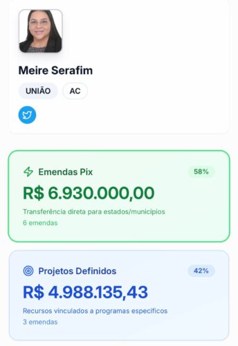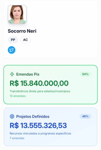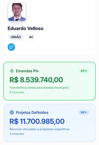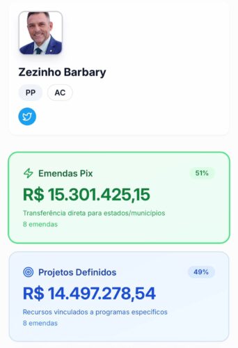 No Acre, os números chamam atenção. Somados os valores destinados pelos deputados federais do estado apenas por meio das chamadas transferências especiais, o montante chega próximo de R$ 100 milhões em 2025. O valor pode ser ainda maior, já que a plataforma não contabiliza os dados do deputado federal Zé Adriano, do Progressistas, que assumiu o mandato neste ano no lugar de Gerlen Diniz, eleito prefeito de Sena Madureira. Como a posse é recente, as informações sobre suas emendas ainda não aparecem no sistema.