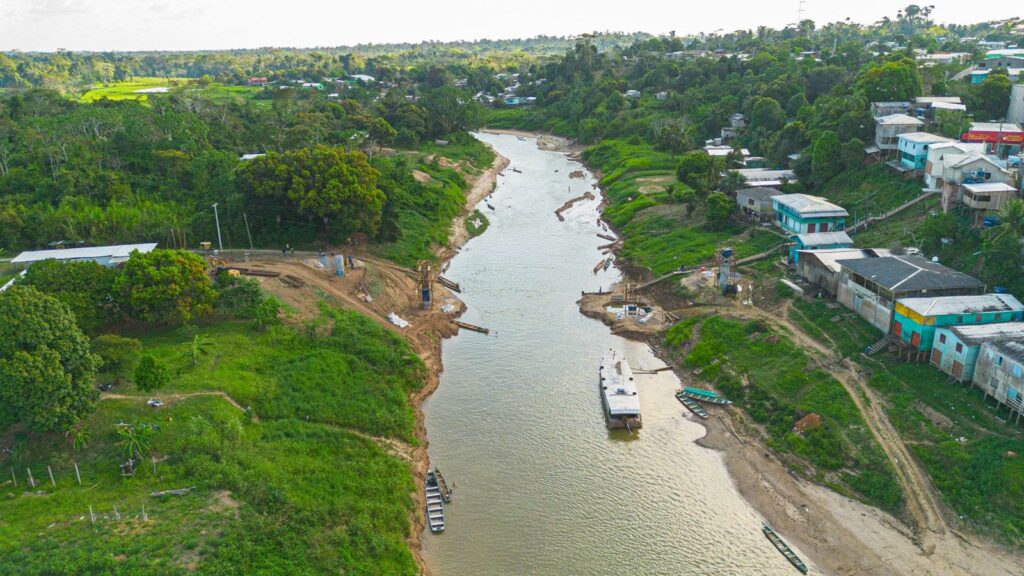 O Deracre avançou com o lançamento das vigas metálicas da ponte sobre o Rio Andirá, no Ramal dos Paulistas, na Vila do V, em Porto Acre. A obra já alcançou cerca de 50% de execução e substitui a antiga estrutura de madeira por uma ponte de concreto armado e aço, com 68 metros de extensão e 5,20 metros de largura.