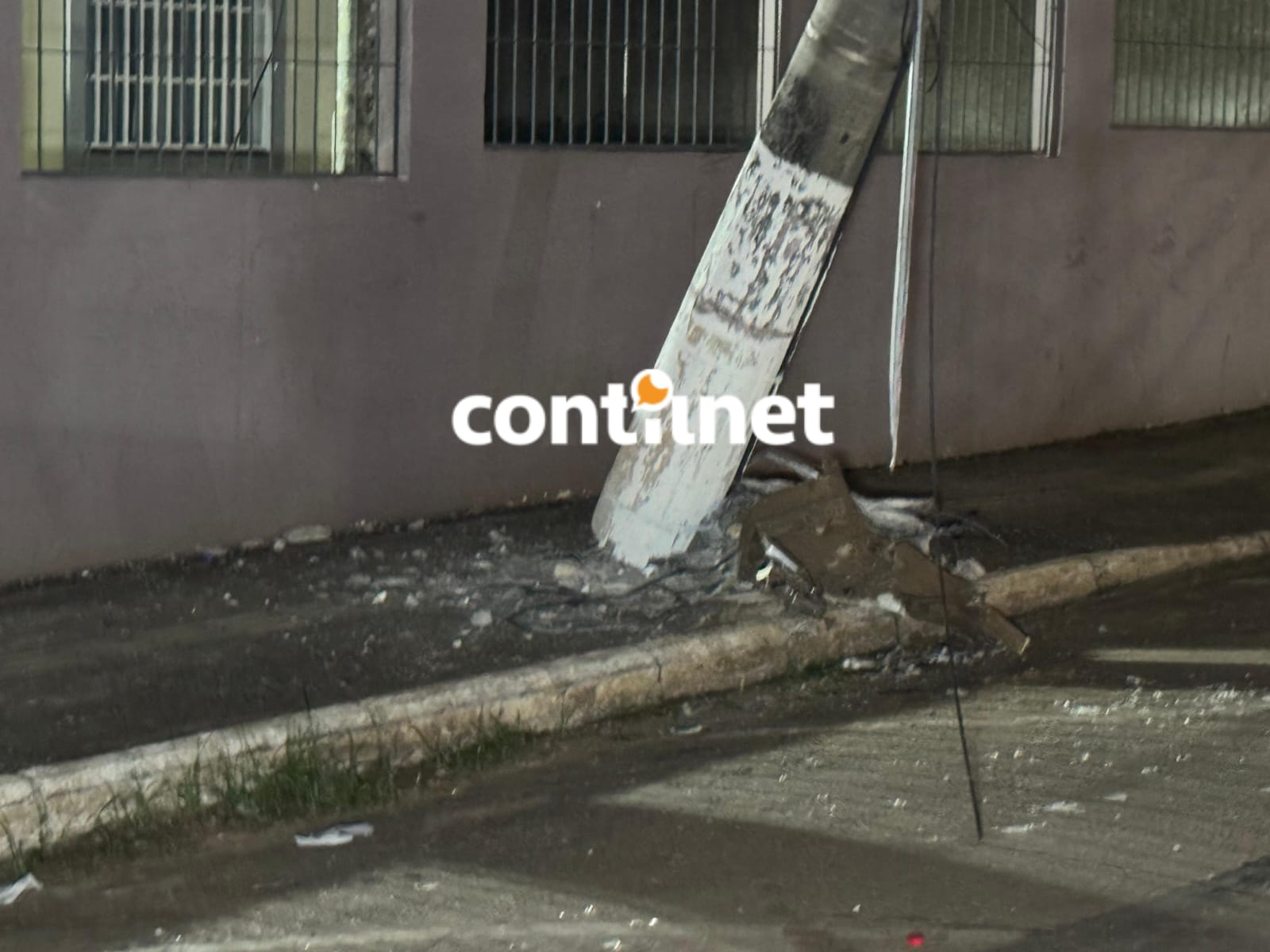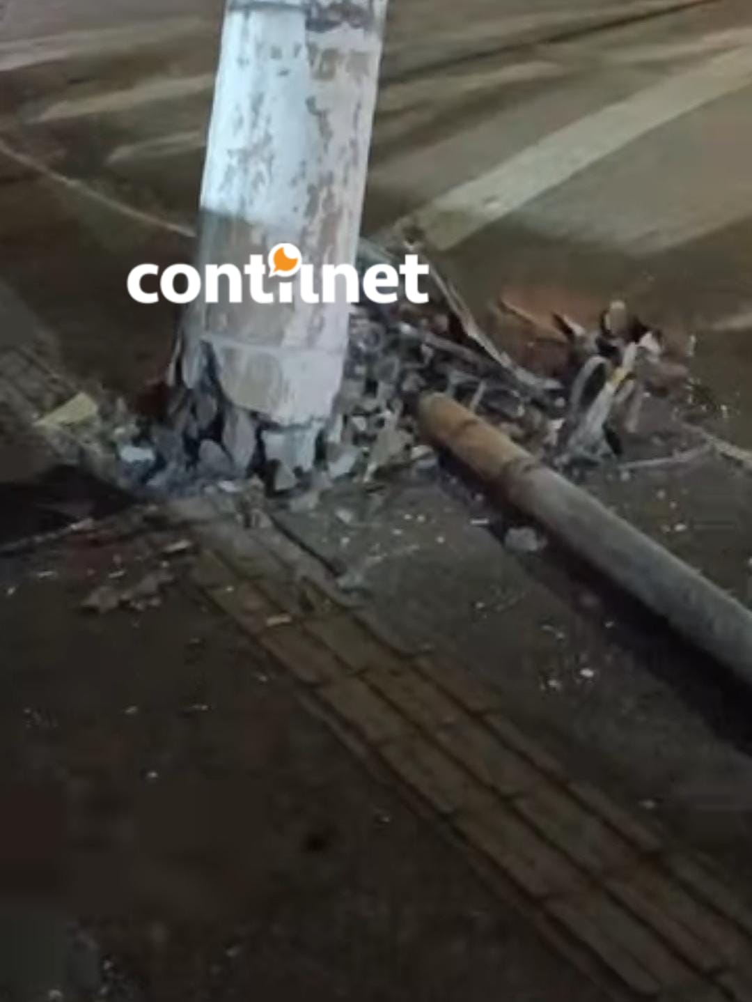 Com o impacto, o poste quebrou e, por pouco, não caiu na via pública, permanecendo sustentado apenas pelos fios de alta tensão./ Foto: ContilNet