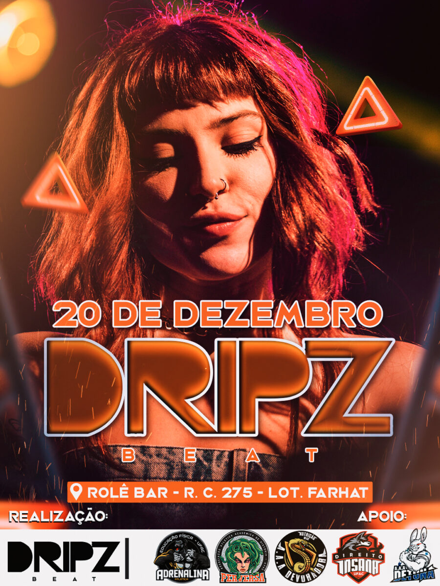 A festa DRIPZ Beat será realizada no dia 19 de dezembro, em Rio Branco, com uma proposta voltada à música eletrônica, fluxo jovem e experiências imersivas. O evento acontecerá no Rolê Bar, localizado na Rua C, nº 275, no Loteamento Farhat.