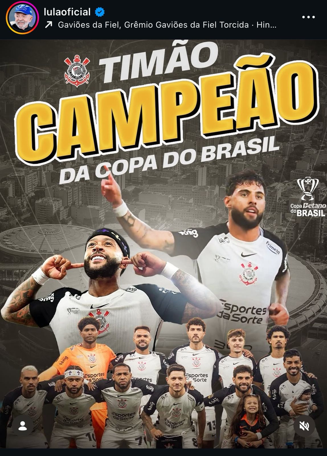Na arte aparecem Memphis Depay, Yuri Alberto e demais atletas do Corinthians, além do troféu da Copa do Brasil. O Presidente ainda escreveu: “Presente de Natal antecipado pra nação corinthiana. Parabéns, Timão! ✨”.