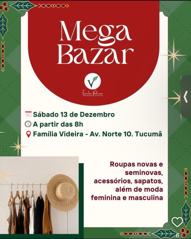 O Mega Bazar da igreja Família Videira será realizado neste sábado (13), a partir das 8h, nas dependências da instituição, localizada na Avenida Norte nº10, no bairro Tucumã. A ação reúne roupas novas e seminovas, além de acessórios e sapatos destinados ao público feminino e masculino.
