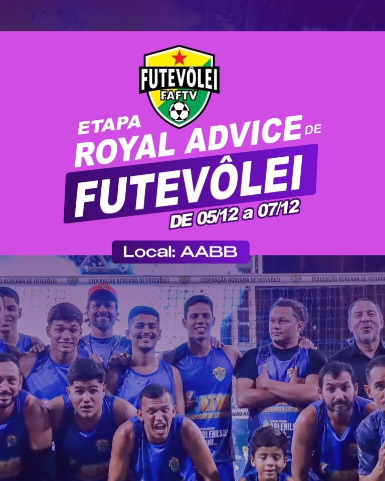 A Federação Acreana de Futevôlei (FAFTV) realiza, nos dias 05, 06 e 07 de dezembro, a Etapa Royal Advice de Futevôlei, evento que marca o encerramento oficial do calendário esportivo de 2025. A competição promete ser uma das maiores já organizadas pela entidade, com premiação recorde e participação dos principais atletas federados do estado.