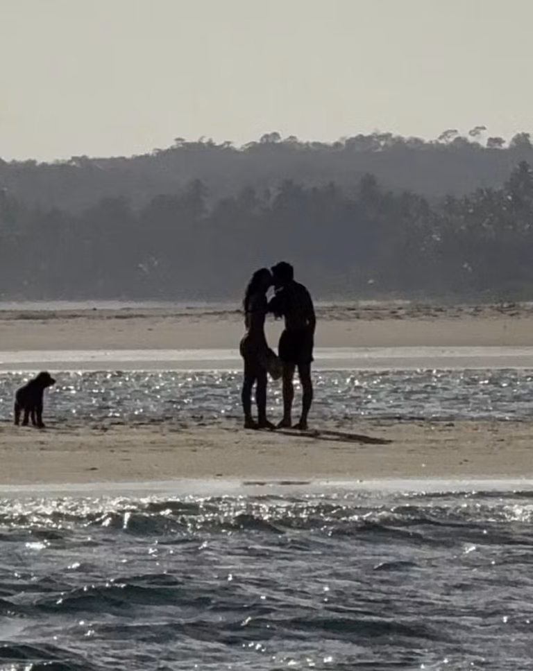O momento aconteceu durante um passeio descontraído pelo cenário paradisíaco da região. Os dois caminhavam acompanhados de Chihiro, a cachorrinha de estimação de Bruna, quando trocaram carícias e um beijo, sem se preocupar com a presença de curiosos.