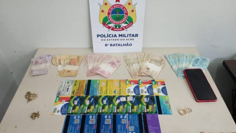 Ao chegar à agência, os policiais identificaram um homem com as características informadas, que realizava saque em um dos caixas eletrônicos e demonstrou nervosismo ao perceber a presença da equipe. Durante a abordagem, foi constatado que o suspeito estava de posse de vários cartões bancários, incluindo cartões de programas sociais, além de uma quantia significativa em dinheiro.