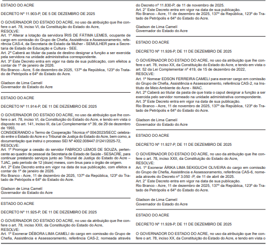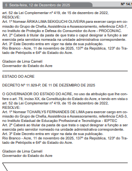 Entre as mudanças, está a exoneração de Débora Lima Cameli do cargo em comissão do Grupo de Chefia, Assistência e Assessoramento, referência CAS-2. A função passa a ser ocupada por Edson Ferreira Cameli, que foi nomeado para o mesmo nível de comissão e atuará no Instituto de Meio Ambiente do Acre (IMAC).