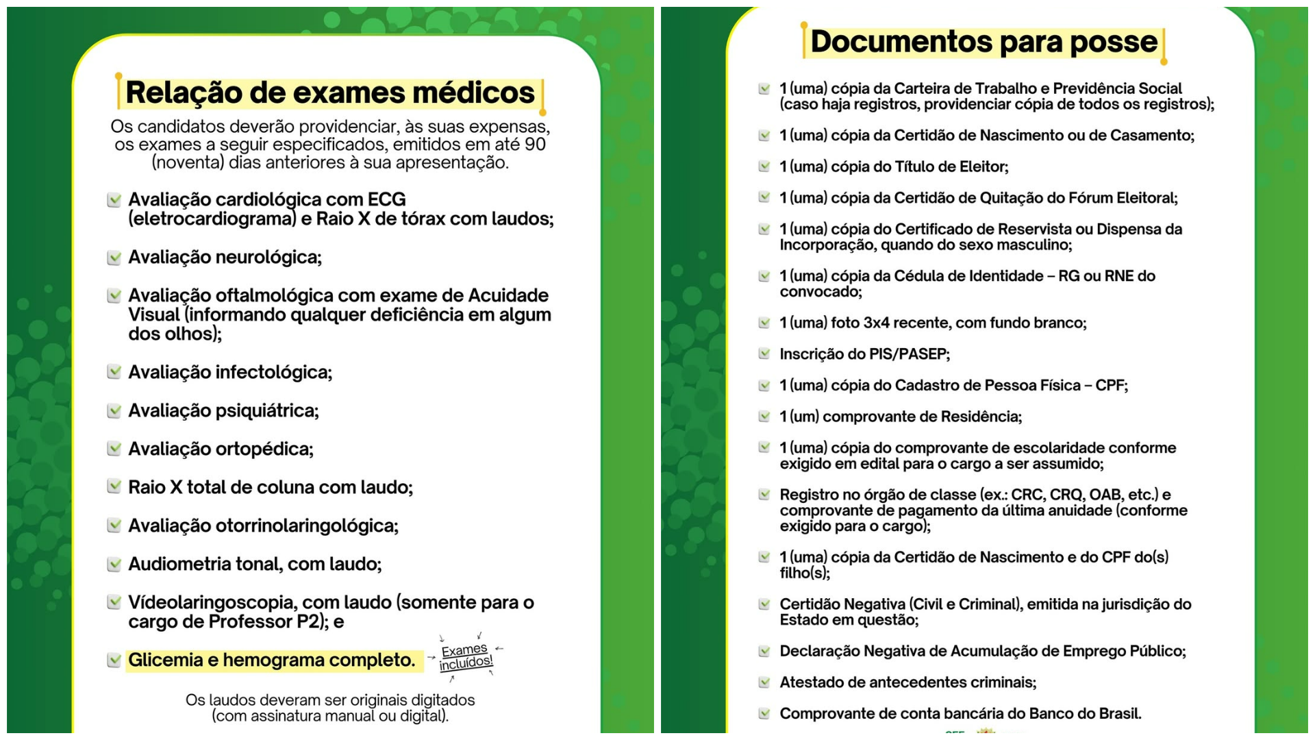 Além dos exames, o governo também falou sobre a documentação obrigatória para a posse. A lista inclui documentos pessoais, como RG e CPF, título de eleitor com comprovante de quitação, documento de reservista para candidatos do sexo masculino, comprovante de escolaridade, certidões negativas e dados de conta bancária do Banco do Brasil.