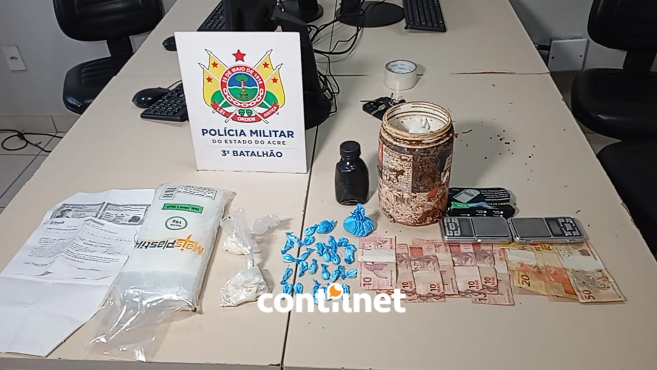 Os militares realizaram o cerco e conseguiram detê-lo. Em seguida, iniciaram buscas na área de mata por onde o suspeito havia passado instantes antes da abordagem. No local, os policiais encontraram um pote enterrado e coberto de barro, contendo mais porções de cocaína embaladas da mesma forma que as apreendidas no momento da ação. Também foram localizadas duas balanças de precisão, dinheiro e anotações que indicam o comércio de drogas.