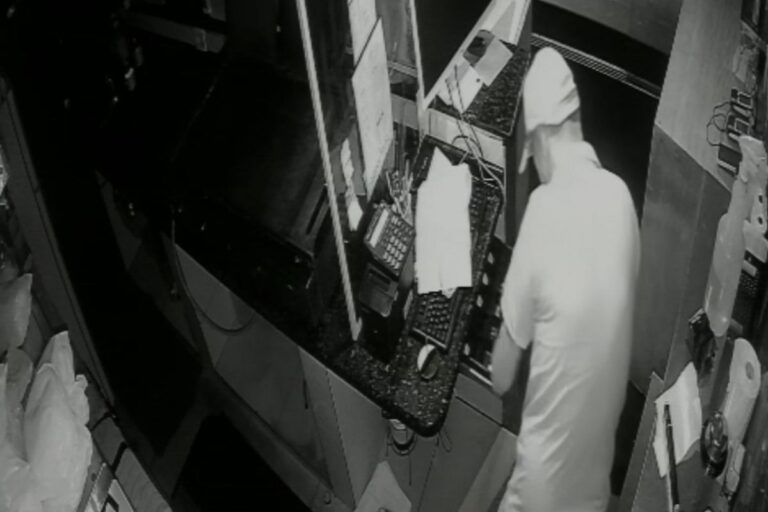 Na gravação de uma câmera de segurança, é possível ver o homem forçando uma porta de vidro para entrar no estabelecimento. Em seguida, ele vai diretamente até a caixa registradora, força a gaveta e pega o dinheiro antes de fugir a pé. O roubo aconteceu por volta das 4h10 e durou menos de dois minutos.