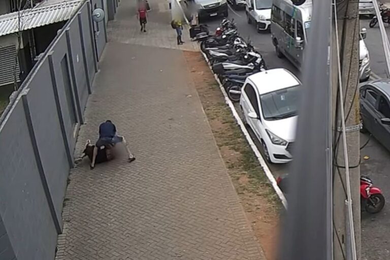 Nas imagens, Ă© possĂvel ver o homem pressionando o pescoço da mulher contra a parede. Em seguida, ele a derruba no chĂŁo e segue a enforcando. Um agente de trĂąnsito que testemunhou a cena e guardas civis se aproximam rapidamente e imobilizam o agressor.