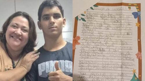 A carta também demonstra seu carinho por pessoas ao redor e o quanto valorizava o apoio emocional. “Agradeço por tudo e a todos”, escreveu ele, com caligrafia infantil e esperançosa.