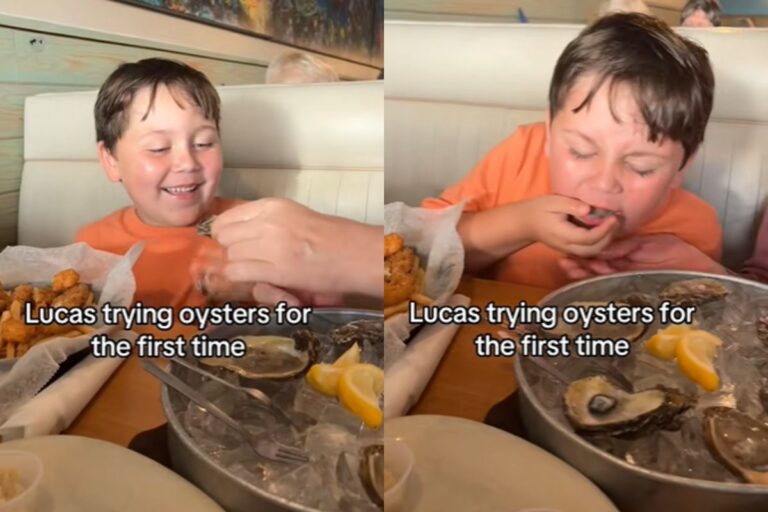 Em um vídeo compartihado por Candice, mãe de Lucas, é possível o menino sentado em um restaurante, com os olhos arregalados e um sorriso no rosto, enquanto segura uma ostra. Sem hesitar, ele engole o alimento — e imediatamente recua.