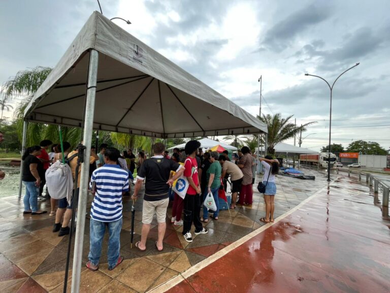 Depois de horas de chuva intensa, o tempo começou a dar trégua na tarde deste domingo (14) em Rio Branco, o que possibilitou o início da chegada de manifestantes ao Lago do Amor. A mobilização é contra o Projeto de Lei da Dosimetria e contra o Congresso Nacional.