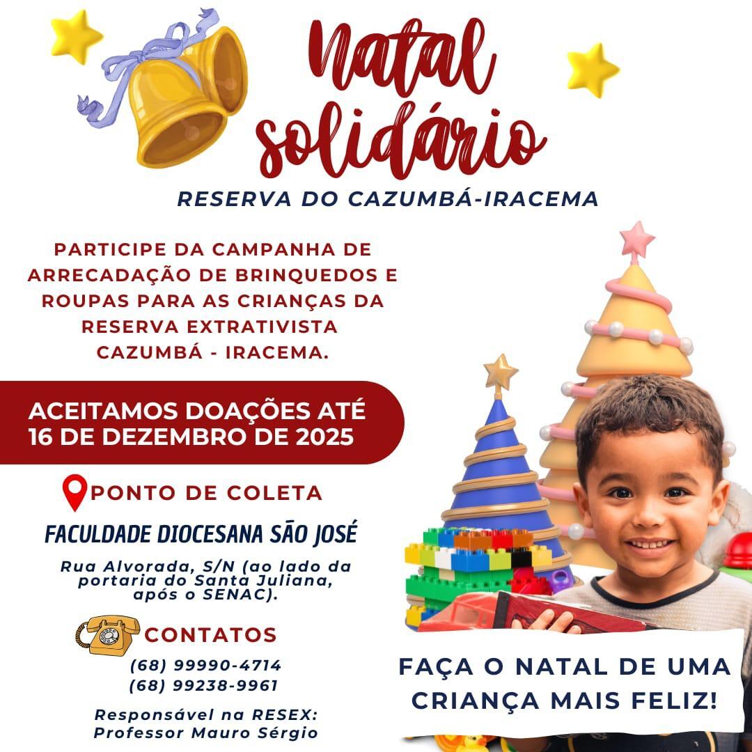 A campanha Natal Solitário na Reserva do Cazumbá-Iracema reúne professores, estudantes e instituições para arrecadar brinquedos e roupas voltadas a crianças de zero a 12 anos que vivem em uma das áreas mais remotas da Amazônia acreana. A ação envolve moradores da Reserva, alunos do curso de Direito do polo da Ufac em Sena Madureira, integrantes do ICMBio local, professores da Faculdade Diocesana São José (Fadisi), pesquisadores do doutorado em Educação do Campo pelo projeto EducaNorte e a Pró-Reitoria de Extensão da Ufac.