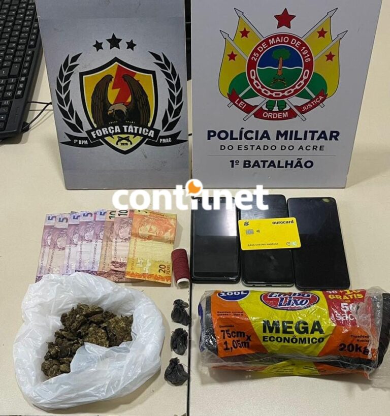 Durante a busca, foram apreendidas uma porção de maconha, pesando aproximadamente 46 gramas, três porções de cocaína, totalizando cerca de duas gramas, encontradas em uma cômoda, além de R$ 65,00 em dinheiro divididos em oito cédulas, um cartão bancário em nome do suspeito, um rolo de linha vermelha, um pacote de sacos plásticos — materiais comumente utilizados para embalar drogas — e três aparelhos celulares.