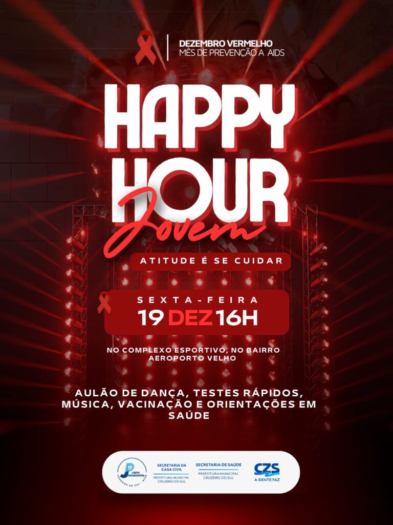 A Prefeitura Municipal de Cruzeiro do Sul, por meio das Secretarias Municipais de Saúde e de Cultura realizará no Complexo Esportivo do Bairro Aeroporto Velho, no próximo dia 19 de dezembro, um Hapyy Hour Jovem, Atitude é se cuidar, em alusão à Campanha Dezembro Vermelho.