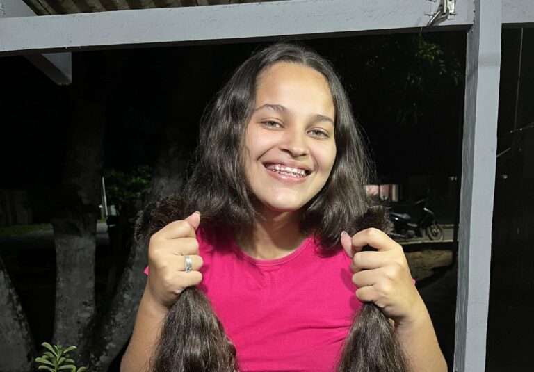 Residente no bairro Florentino, em Sena Madureira, a jovem Kaline Oliveira da Silveira, 19 anos, praticou um gesto de amor ao próximo recentemente. Ela cortou seus cabelos cumpridos e doou para o Hospital do Câncer do Acre.