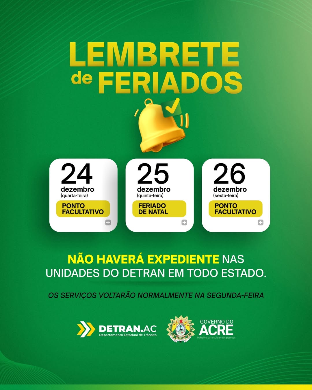 O Departamento Estadual de Trânsito do Acre (Detran/AC) informou que não haverá expediente em nenhuma de suas unidades em todo o estado nos dias 24 (ponto facultativo), 25 (feriado de Natal) e 26 (ponto facultativo). O atendimento ao público será normalizado a partir da próxima segunda-feira (29).
